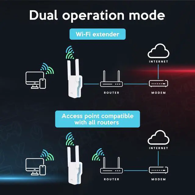 Versatile Connectivity Solutions - Experience seamless networking with our WiFi Extender with Ethernet Port that offers two operation modes: Wi-Fi Extender and Access Point. Compatible with any standard router, providing instant network expansion with plug-and-play technology.