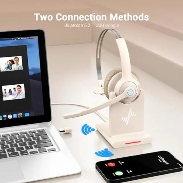 [Advanced Bluetooth 5.2]: V5.2 wireless headset with microphone for laptop allows for faster pairing speed, more secure and stable connection, lower latency, better audio quality, and longer battery life. With a wireless range of up to 10m/33ft, you can multitask with no cords hanging around, walk around without the phone, and remain connected with excellent sound.(Not for desk phones or landlines)