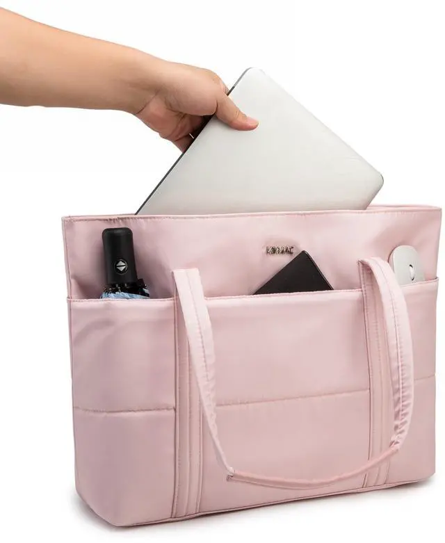 Multi-pocket Design: The laptop tote has a multi-pocket design, which allows you to organize your items in an efficient manner. There are two main compartments, one large compartment for laptops and one small compartment for notebooks, books, water bottles, etc. The two side pockets are perfect for holding your phone, wallet, keys, and other small items.