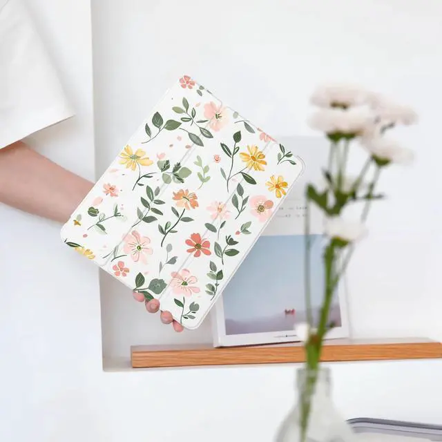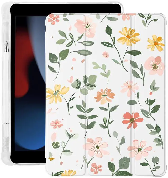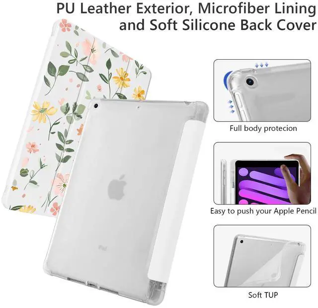 Cute Floral Leaves for iPad mini 6 Case with Pencil Holder, Auto Sleep/Wake, Leather Soft TPU Back Cover