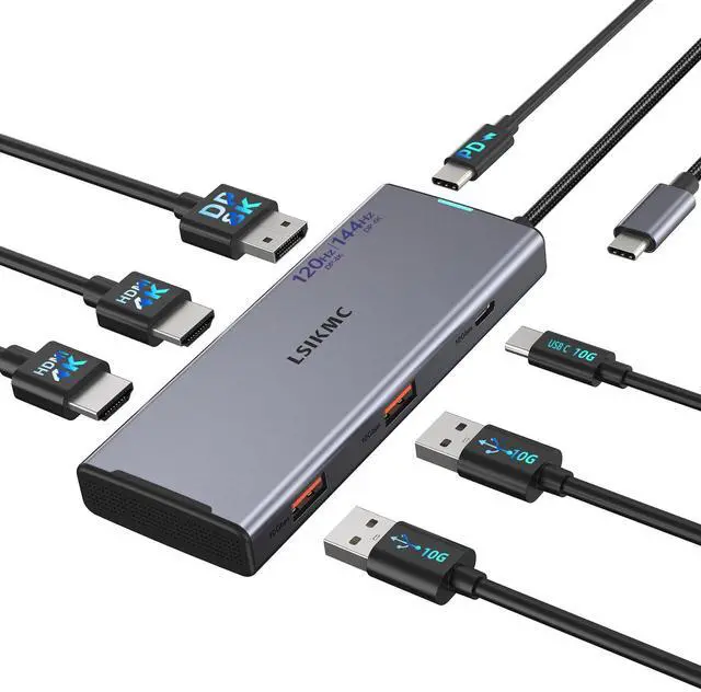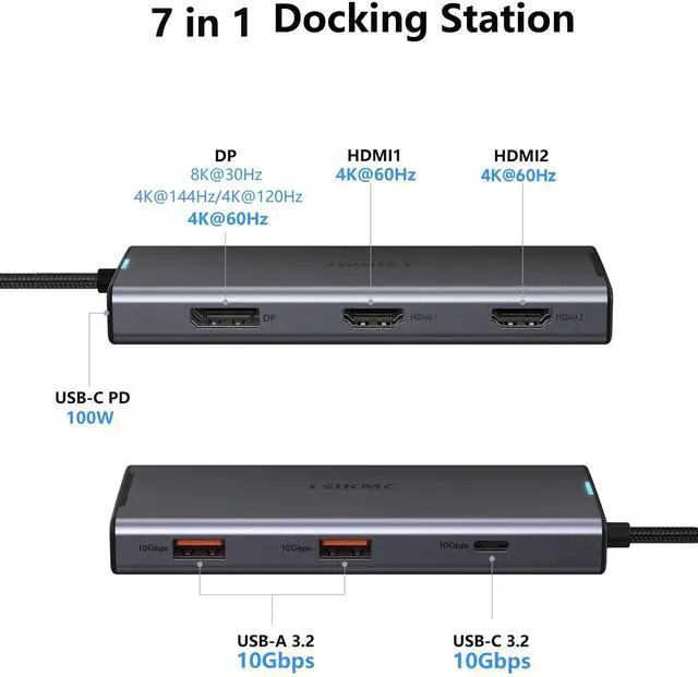 7 in 1 Universal Docking Station: Enhance your desktop setup with this versatile PC monitor hub, featuring dual HDMI outputs for 4K clarity and a DP port delivering 8K@30Hz precision. Equipped with 10Gbps USB C3.2Gen2 and A3.2Gen2 ports for fast file transfers, plus a powerful 100W USB-C charging port to maintain productivity without compromise.