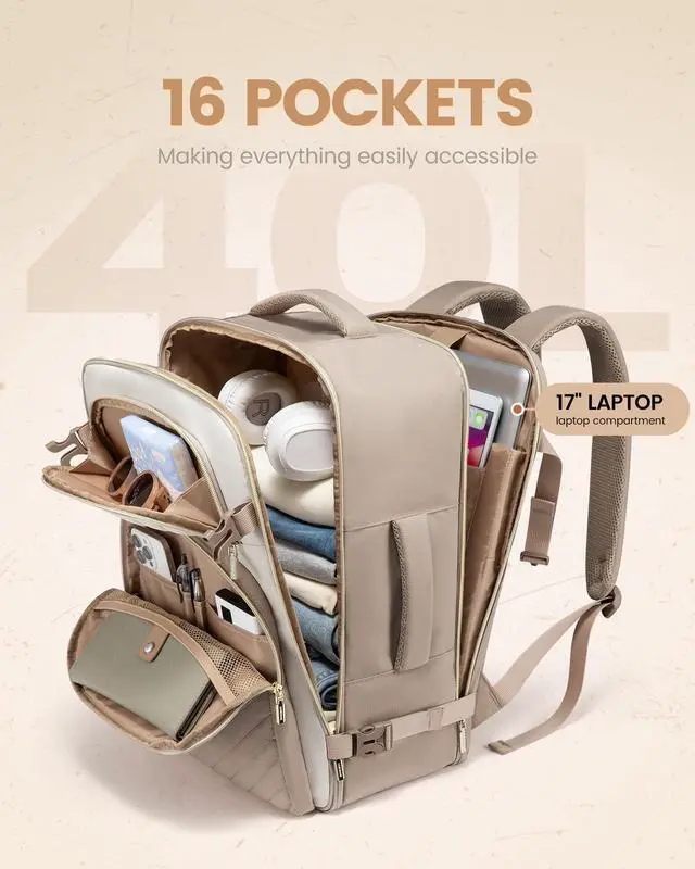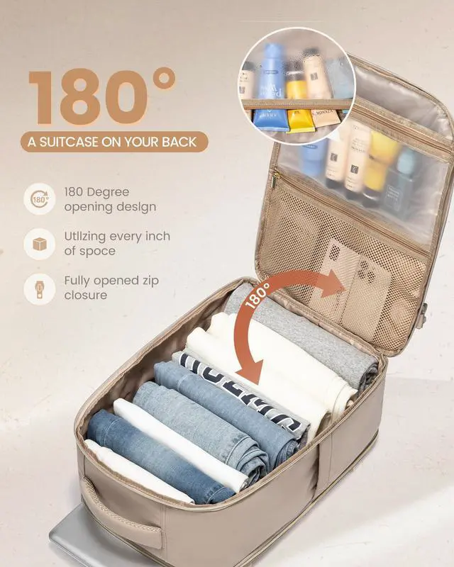 [(Carry on Luggage Opens Like a Suitcase)] : Classic V-shaped embroidery thread. 180degopening design, fully opened zip closure, utilizing every inch of space. The carry on backpack for women has total of 4 compartments and 16 pockets, pack travel essentials for 3-7 days effortlessly. 40l backpack size: 18.5*13.5*8 inch weight: 3.65 lbs.