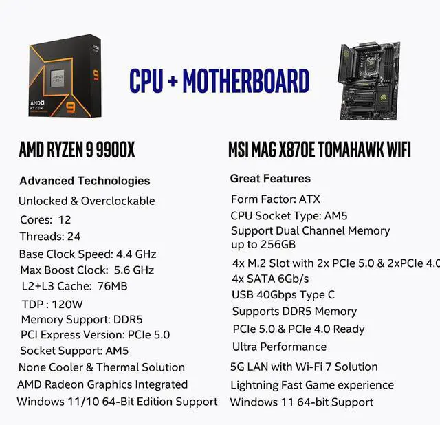 Micro Center AMD Ryzen 9 9900X CPU Processor with MSI MAG X870E Tomahawk WiFi ATX Motherboard (DDR5, PCIe 5.0 x16, M. 2 Gen5, Wi-Fi 7, 5G LAN)