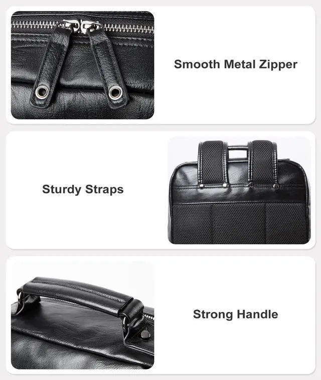 SIZE: This mens black PU leather backpack measures 11.4" * 5.5" * 16.5" (29cm * 14cm * 42cm) with a 17-liter capacity, perfect for daily commuting, work, travel, and college use. The main compartment offers ample space, featuring a dedicated laptop sleeve (fits up to 15.6-inch laptops), two inner pockets, one front zippered pocket, and two side pockets. Whether you need to carry office supplies, books, or travel essentials, this high-capacity backpack keeps everything organized and within reach