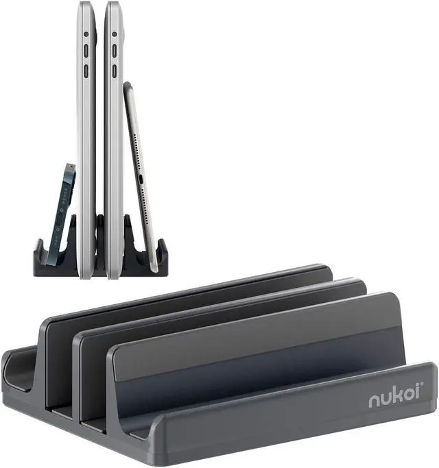 Nukoi Vertical Laptop Stand - SPACEMax Adjustable GRIPLock Anti-Tip Silicone 4 Slots Aluminum Desktop Holder - Double Dock Stand - 2 Phone Slots Fits Up to 17.3" Laptops, Tablets, Phones - Gray