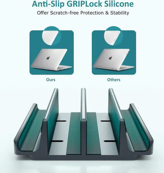 GRIPLock - HD Protection - Anti-Tip, Anti-Slip: We tested more than the 20 top vertical laptop dock models before perfecting the SPACEMax, engineering it from Solid Core Heavy Duty Aluminum for weighted balance and heft, then added GRIPLock Silicone Lining so your device stays upright, secure and scratch free.