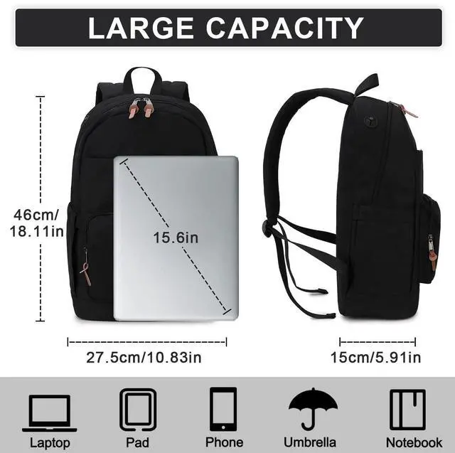 EASY TO ORGANIZE:Classic backpack features separated compartments and pockets that fits all of the stuffs you need.External access to 2 front zipper pockets,2 side pockets for water bottle ,1 anti theft back zipper pocket for wallet,Internal access to 1 main zipper compartment includes 1 padded laptop compartment fits 15.6 inch laptop,2 slip pockets and 3 zipper pockets keep all your things organized and easy to access.