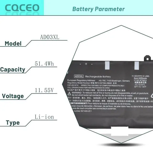 AD03XL Laptop Battery for HP ENVY 13-AD 13-AD000 13T-AD100 13-AD001NO 13-AD001TX 13-AD002NA 13-AD002NG 13-AD109TX Series HSTNN-DB8D TPN-128 921409-2C1 921439-855 921409-271 11.55V / 51.4W h/4450mAh/4Cell