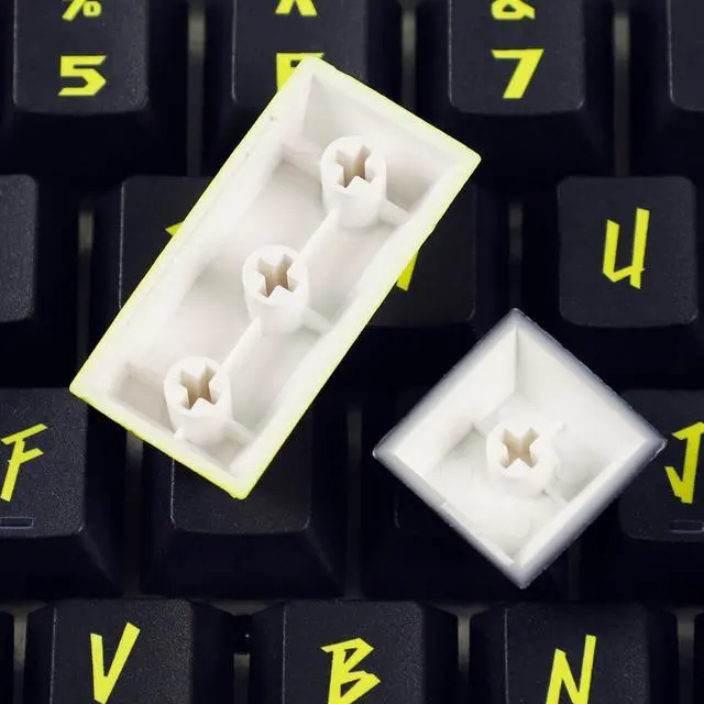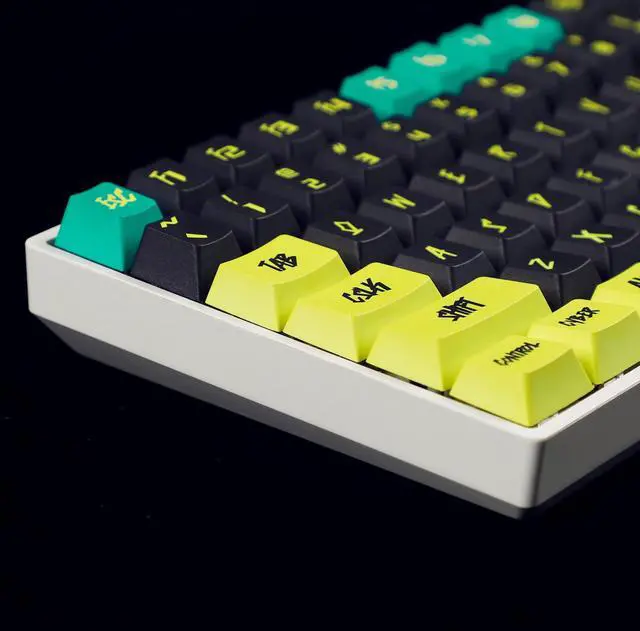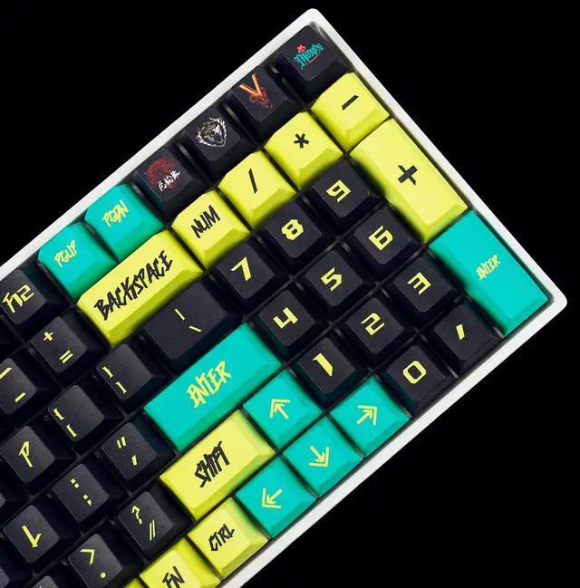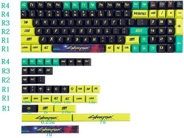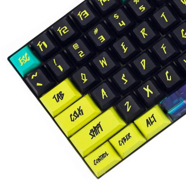 Package Included: 1x 136 Cyberpunk Cherry Profile Dye Sublimation Keycaps + Puller ^^ The printed ones are dye-sublimation. The dark keys are all five sided over dye-sublimation ^^ Cherry profile is similar to OEM profile and it's lower than OEM profile ^^ This keycaps is made of PBT. The thickness is around 1.4 - 1.55 mm. The injection point is on the corner back of the keycaps. This is not defects. ^^ Compatible with ANSI Mx mechanical keyboard 61 64 68 75 84 87 96 104 108 layout whose space is 6.25 u, namely 11.7 cm