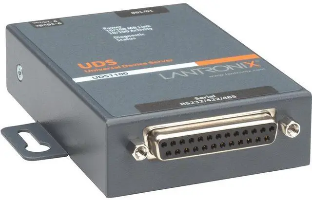 With the UD1100001-01, virtually any piece of equipment can be added to an Ethernet network in a matter of minutes! This single-port device server is a quick, simple and inexpensive way to bring the advantages of remote management to equipment not currently connected to a network. Lantronix UDS1100 - One Port Serial (RS232/ RS422/ RS485) to IP Ethernet Device Server - UL864, US Domestic 110VAC - Convert from RS-232, RS-485 to Ethernet using Serial over IP technology; UL864 Compliant; Wall Mountable, Rail Mountable, One DB-25 Serial Port; One 10/100 Mbps Fast Ethernet RJ-45 Port