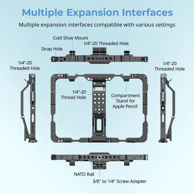 Expansion Interfaces: This cage comes with standard 1/4'', 3/8'' threaded holes, positioning holes, shoulder strap slots, cold shoes, and sliders, making it compatible with a variety of setups, including NPF adapters, power bank holder, SSD brackets, handles, tripods, etc. ^^ Sturdy and Easy to