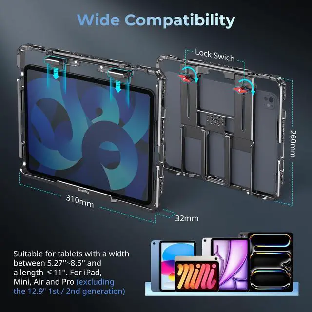 Multifunctional Use: SmallRig Cage for iPad is designed to enhance your creative workflow. It transforms your device into a professional monitor or multifunctional desktop tablet. The design fits the body perfectly, and the built-in rubber pad protects the device without blocking the microphone, charging port and buttons. ^^ Comes with