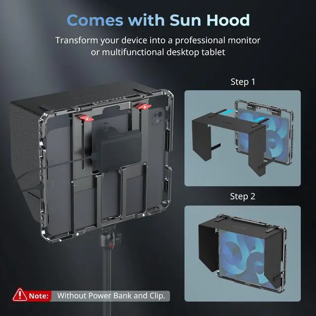 Sun Hood: The cage includes a detachable Velcro sun hood for better outdoor visibility, an adjustable support stand for stable desktop use, and a magnetic slot for Apple Pencil storage.