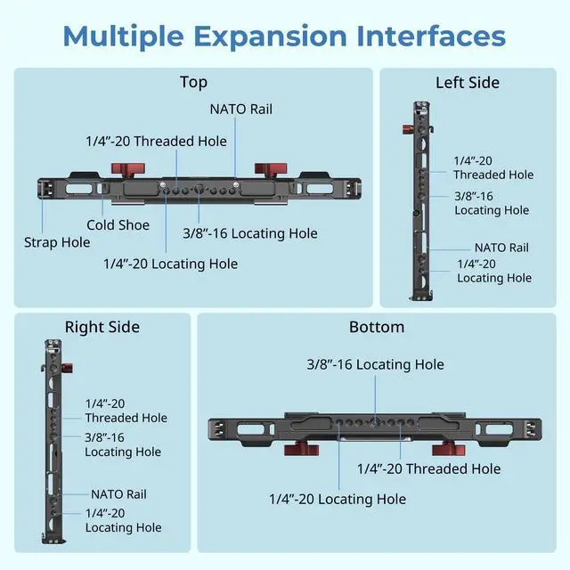 ^^ Multiple Expansion Interfaces: This cage comes with standard 1/4'', 3/8'' threaded holes, positioning holes, shoulder strap slots, cold shoes, and sliders, making it compatible with a variety of setups, including NPF adapters, power bank holder, SSD brackets, handles, tripods, etc. ^^ Sturdy and Easy to