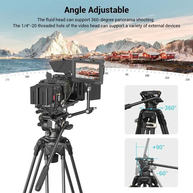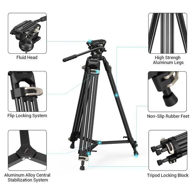 the maximum load is: 8KG/17LBS. ^^ Professional Fluid HeadBuilt-in damping and balancing system enable 360 horizontal and +90/-60 vertical movements. The camera fluid head adopts side-pressed quick release, which can be unlocked by pushing the side button to realize the quick disassembly and installation of the camera. ^^ Portability and Storage ConvenienceFeaturing a spacious carrying handle on the tripod and an anti-slip design, this professional tripod ensures easy portability and comfortable transitions. Additionally, the quick release plate features a built-in wrench for convenient use. For easy storage, the tripod comes with a handbag equipped storage option. ^^ Package Includes1 x heavy-duty fluid head tripod1 x carrying bag, 1 x 1/4''-20 screw, 1 x 3/8"-16 screw, 1 x user manual.