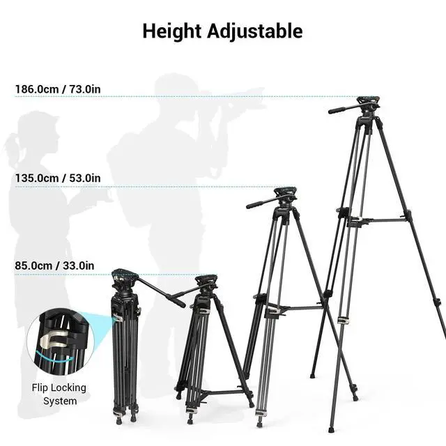 Dual-Mode Quick-Release Plate MountThe fluid head is compatible with two modes of quick-release plates - Mode for DJI RS 2/RS3/RS3 PRO,. This dual-mode mount design allows you to switch between the two quick-release plate. ^^ Stable and Adjustable TripodProfessional heavy duty aluminum double-tube tripod with built-in bubble level, high-strength aluminum alloy double-row tubes and 75mm bowl bottom, which can provide better stability for the video tripod. The adjustable height of the travel tripod is: 85-186cm/33-73in, and