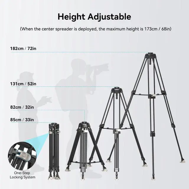 One-Step Locking & Quick Adjustment: The Heavy Duty Professional Video Tripod is a video tripod that makes video capture faster and enhances work efficiency. The tripod legs adopt a one-step locking system - operating a single toggle can lock two legs quickly, with a height ranging from 31"-72" (79 cm-182cm) and a folded length of 33" (85cm) ^^