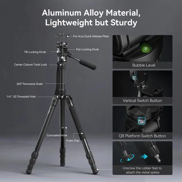 ^^ Innovative 90 Rotatable QR PlateThis camera tripod features a unique design that allows you to switch the mounting direction of the quick release plate with ease. By pressing the base button, you can smoothly switch the QR plate mount from vertical to horizontal installation direction. It supports direct horizontal usage for Cage, L-plate, and QR plate for Arca-Swiss. This feature enables various camera mounting options for creative versatility. ^^ Flexible Shooting AnglesThe aluminium travel tripod offers a quick-angle adjustment plate buckle that easily switches between three shooting angles (23/55/79) based on your scene.