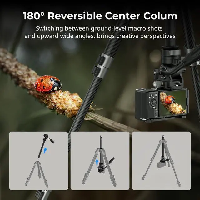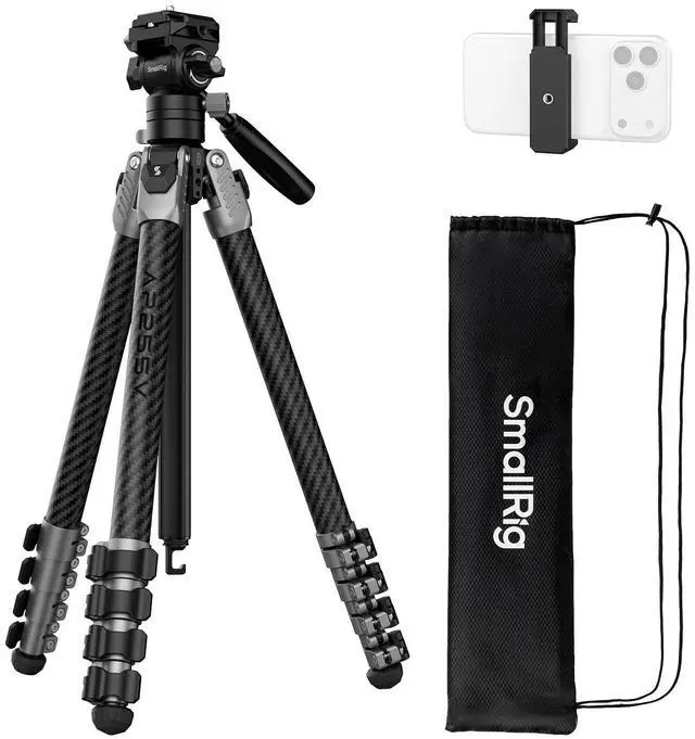 Carbon Fiber Travel Tripod for Camera - SmallRig AP255Pro is a compact carbon tripods for travel videographers. With a max leg diameter of 25.5 mm/1" and a 5-section leg design, brings exceptional portability. The max height is 160cm / 63 with the center column and folding down to just 52cm/ 20.5 in, weighing only 1.5 kg/ 3.3 lb, ideal for on-the-go shooting ^^ Bowl Base for Quick Leveling - This tripod head is equipped with bowl base allows for fine tuning, allowing for quick leveling without adjusting the legs, making it ideal for outdoor landscape shooting, urban architecture shooting, and more ^^ 180 Reversible Center Colum - 180 inverted design enables switching between ground-level macro shots and upward wide angles, brings creative perspectives.