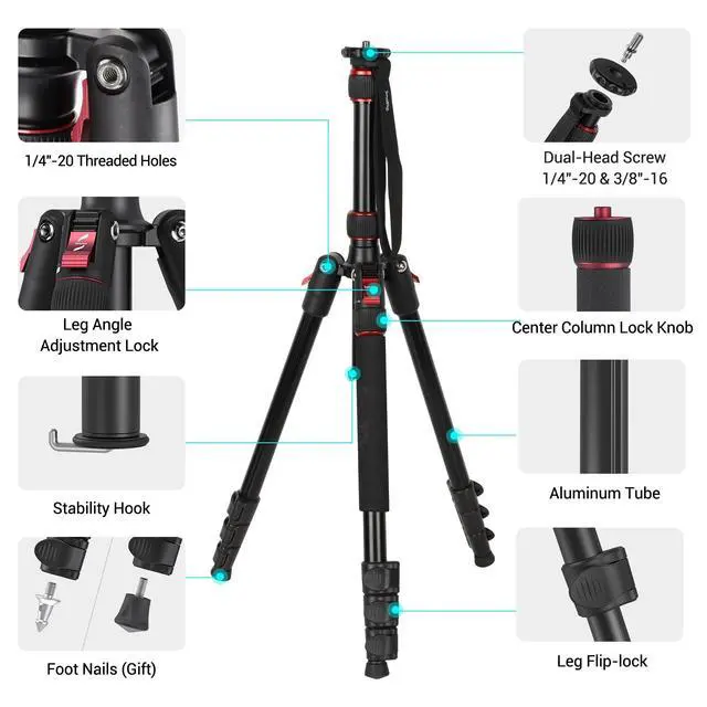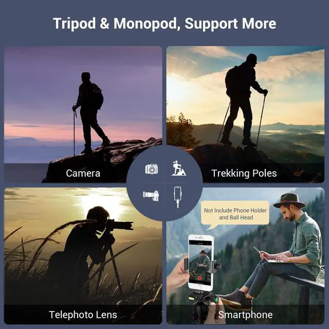 Compatibility: This video tripod for camera is universally compatible with all 1/4"-20 and 3/8" threaded holes video head, after equipped with ball head and quick plate, you can easily use the tripod to support your device such as DSLR, action cameras, mirrorless cameras, cell phones and projectors. Notevideo head and quick release plate are not included, for camera with telephoto zoom lens, you need to buy a tripod mount ring additionally or telephoto lens bracket for better balance. ^^ 2-in-1