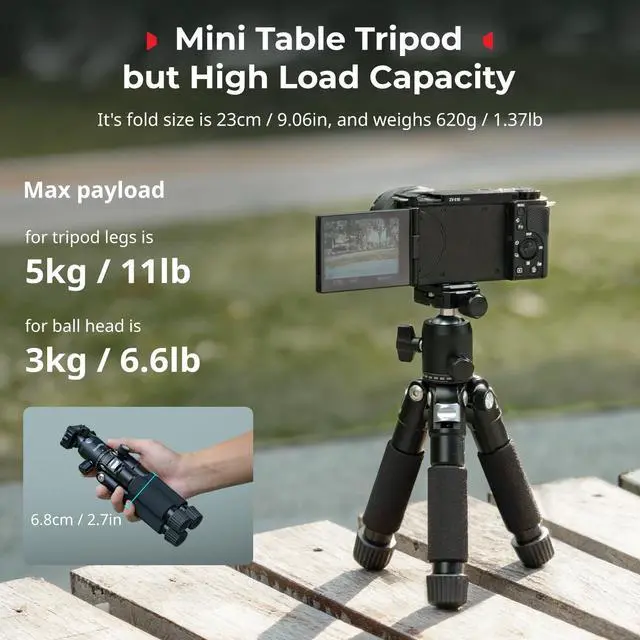 Upgraded Design - With a vertically adjustable center column, this table tripod can be folded to smaller size for easy carry and storage. Its fold size is 23cm / 9.06 in, less than 7cm, and weighs 620g / 1.37 lb, making it compact and lightweight ^^ 21.2" / 53.8 cm Desk Tripod - VT-20Pro tripod extends to a working height of 53.8 cm / 21.2 in, accommodating diverse shooting perspectives. The aluminum alloy tripod legs support a payload of 5kg / 11lb (3kg / 6.6 lb for the ball head) ^^ Versatile Shooting Angles - This small travel tripod has a quick angle adjustment lever, offering three angle options (23/50/80) to meet different shooting angle demands ^^ Compatibility - Tripod leg is compatible with ball heads, video heads, or stabilizers featuring 3/8''-16 threaded holes.