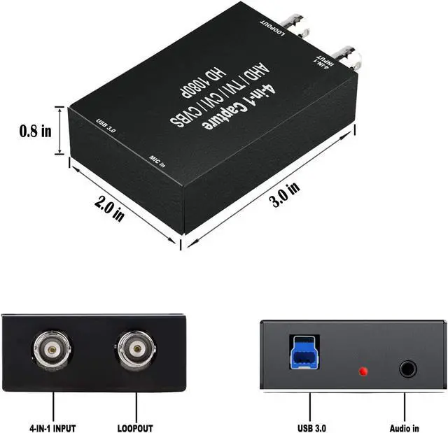 BNC/AHD/TVI/CVI/CVBS to USB 3.0 Capture CardBNC standard interface design. The USB 2.0/3.0 cable and port reads up to 100MB/s. You can reduce the delay in live video or game recording. Great for gaming, meetings or livestreaming to Youtube, Twitch and more! This device is plug-n-play and easy to use,