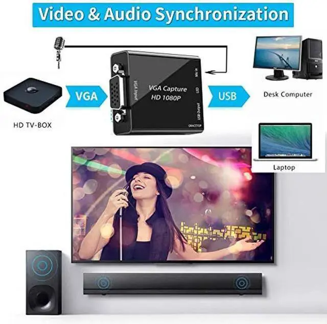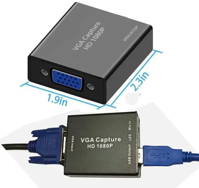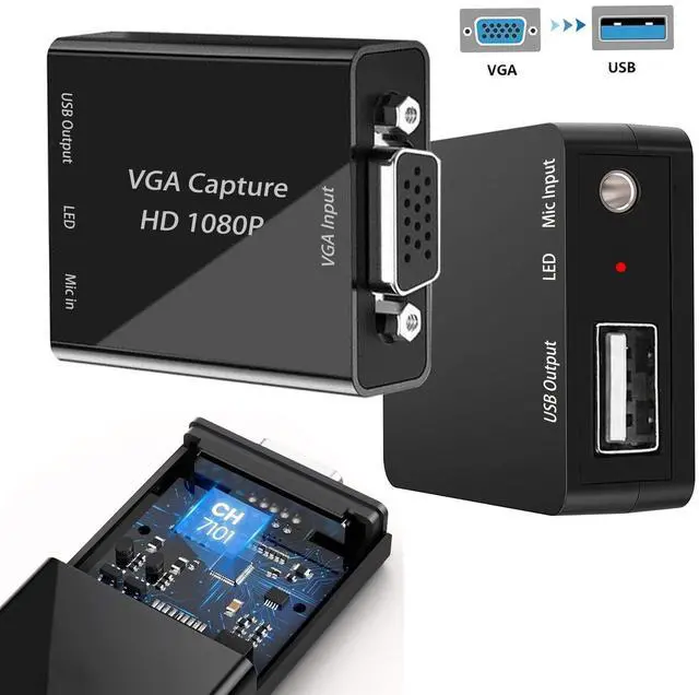 VGA Video Capture Card VGA to USB 2.0 Video Capture Card supports VGA input, capture video up to 720P 30fps with no delay. A great external capture device for Laptop, PC, set-top box, blue-ray, etc ^^ Patent design VGA capture card This capture card offers VGA to USB 2.0 output, Enjoy recording videos from games, broadcast, live artwork etc. Also a great video capture device for you to connect with laptop or tablet to share content in conference rooms or online meetings. ^^ Plug and Play VGA capture card does not need to install a driver, work with most video software and cameras on Windows, Mac, Linux, Android and other operation systems.