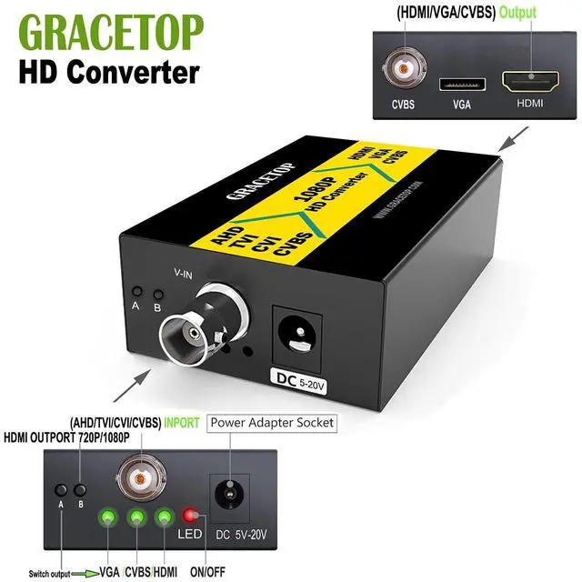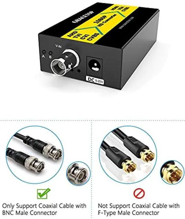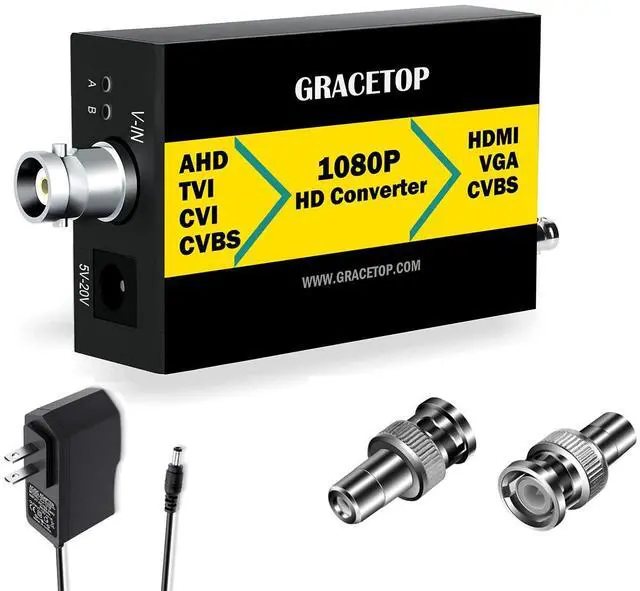 TVI/CVI/AHD to HDMI Converter AdapterBNC to HDMI Converter Convert TVI CVI AHD CVBS BNC Video Signal to HDMI VGA CVBS and Supports 1CH video signal output. CVBS port for tape player, tape camera, VHS, VCR, DVD, DVR, Hi8, game console, etc. AHD converter also works with TVI Camera, AHD Camera, CVI camera. ^^ AHD to RCA converterCVBS support RCA port (include BNC Male to RCA Female Adaptor Connector). Support vhs to digital converter, rca to hdmi converter, av to hdmi converter, Hi8 to hdmi converter.