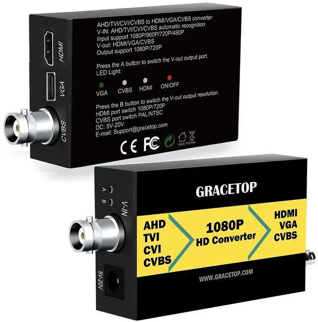 CVI video resolutions: 720p, 1080p. ^^ 1080P AHD to HDMI ConverterHDMI video output is 1080p/720P resolution. HDMI/VGA/BNC supports 1CH video signal output, Press A to switch the output interface, which allows you to send the native HD video signal (TVI, CVI, AHD, CVBS) to another device, such as a surveillance DVR, second converter, or camera tester. ^^ Package Including 1* 4-in-1 BNC to HDMI converter, 1* power adapter, 2* BNC Male to RCA Female Adaptor Connector.