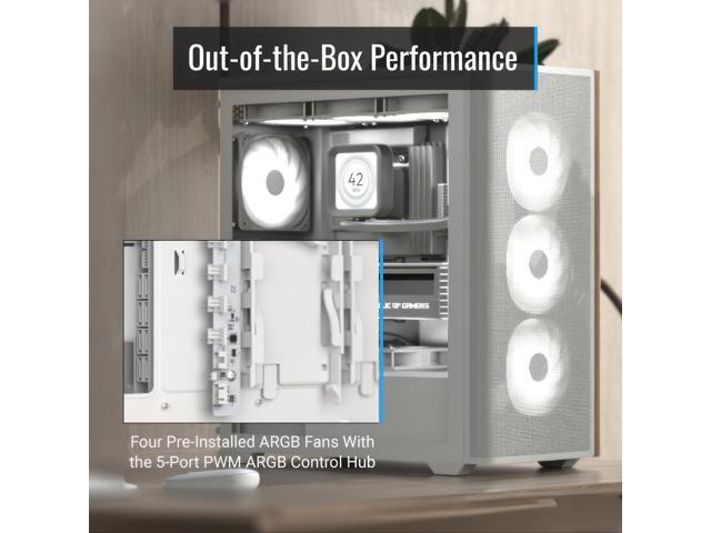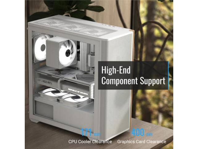 - Supports GPUs up to 400mm (without front radiator installed) and CPU coolers up to 171mm.
