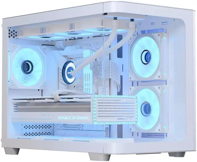 The AeroCool P300C is a compact PC case featuring full tempered glass front and side panels for stunning interior views, complemented by three pre-installed ARGB fans (including two with reverse blades) with a unique mirage infinity mirror lighting effect. It offers versatile cooling options, supporting both air and liquid cooling configurations up to 360mm, and includes a 4-port PWM ARGB fan hub for enhanced performance. Designed for micro-ATX and mini-ITX motherboards, the P300C supports high-end graphics cards up to 450mm, CPU coolers up to 162mm, and provides ample storage with three SSD slots and two HDD drive bays, while ensuring easy maintenance with top and bottom magnetic filters.