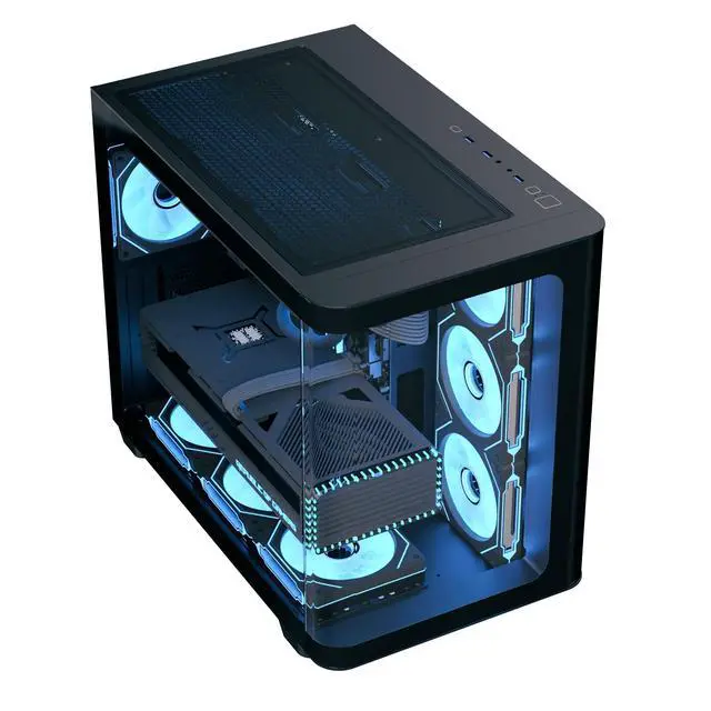 The AeroCool P500C is a mid-tower PC case featuring full tempered glass front and side panels for stunning interior views, complemented by four pre-installed ARGB fans (including three with reverse blades) with a unique mirage infinity mirror lighting effect. It offers versatile cooling options, supporting both air and liquid cooling configurations up to 360mm, and includes a 4-port PWM ARGB fan hub for enhanced performance. Designed for ATX, micro-ATX and mini-ITX motherboards, the P500C supports high-end graphics cards up to 450mm, CPU coolers up to 162mm, and provides ample storage with three SSD slots and two HDD drive bays, while ensuring easy maintenance with top and bottom magnetic filters.