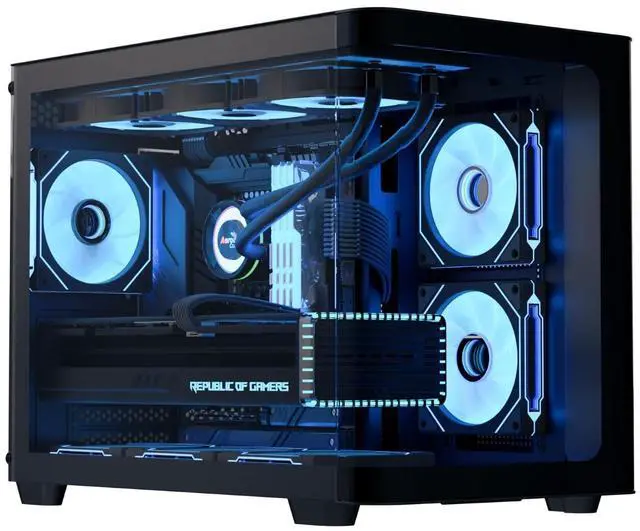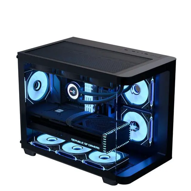 The AeroCool P300C is a compact PC case featuring full tempered glass front and side panels for stunning interior views, complemented by three pre-installed ARGB fans (including two with reverse blades) with a unique mirage infinity mirror lighting effect. It offers versatile cooling options, supporting both air and liquid cooling configurations up to 360mm, and includes a 4-port PWM ARGB fan hub for enhanced performance. Designed for micro-ATX and mini-ITX motherboards, the P300C supports high-end graphics cards up to 450mm, CPU coolers up to 162mm, and provides ample storage with three SSD slots and two HDD drive bays, while ensuring easy maintenance with top and bottom magnetic filters.