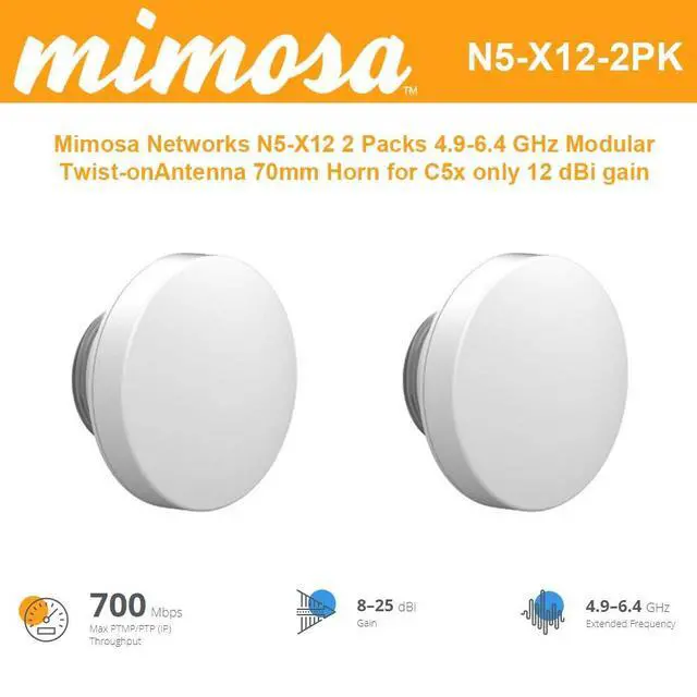 N5-X12 (2 Pack) Modular & Flexible The Mimosa C5x is the industrys most versatile, integrated radio with four modular twist-on antenna options. The ultra-rugged solution provides extended frequency operation from 4.96. 4 GHz, with best-in-class noise immunity. Delivering the ultimate in flexibility and cost efficiency, the C5x is the go-to PTP or PTMP solution for 5 GHz deployments. Incredible RF Performance Encased in metal and leveraging custom-designed horn and Cassegrain antennas, the C5x reduces localized noise and provides immunity from interference with breakthrough front-to-back and front-to-side performance. Each antenna in the N5-X family is optimized to isolate noise with incredible sidelobe rejection.