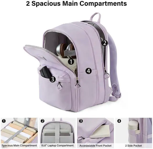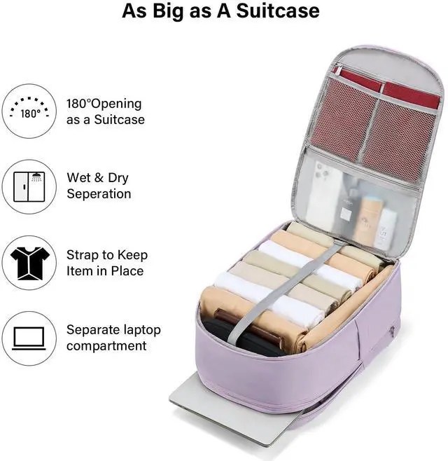 [(Smart Organized)] This carry on bags for airplanes women with 2 spacious compartments and many pockets, including a 180deg openging main compartment that is easy to package all your travel essentials, as well as a wet pocket to keep your wet clothes and toiletries separate from your dry items. Dedicated a padding laptop compartment for 15.6'' laptop, this travel laptop backpack allows you to easily separate electronic products and clothing.