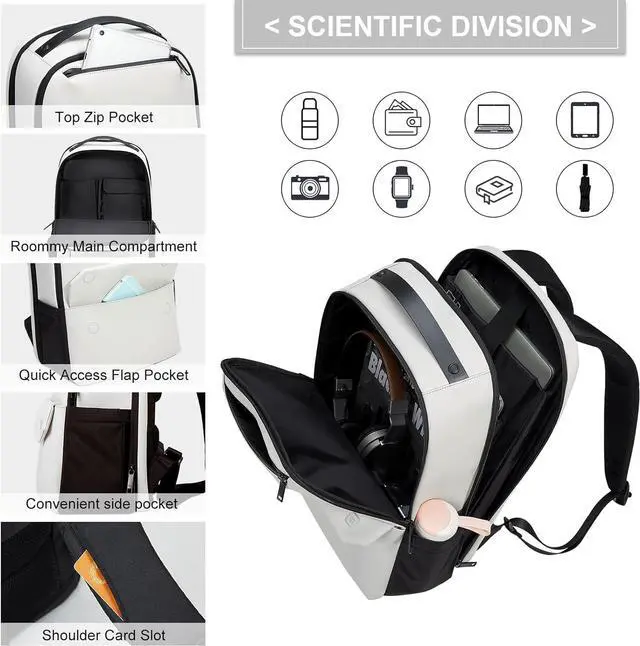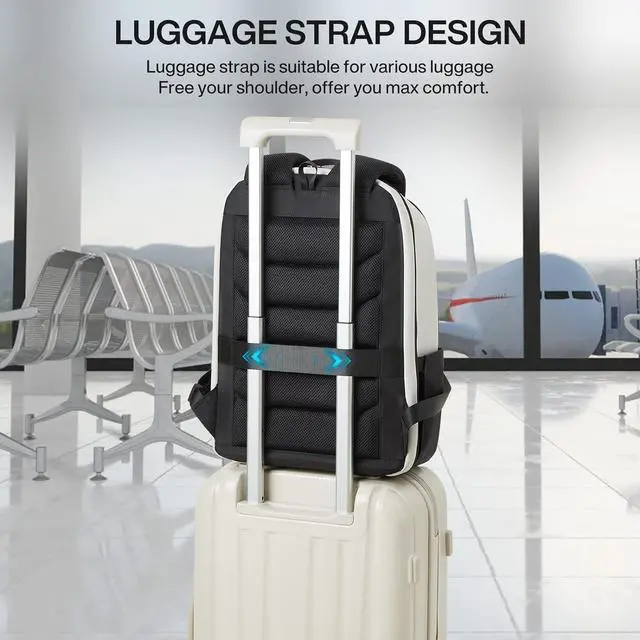 ^^ REVERSE ZIPPER DESIGNThe backpack feature with famous zipper, which is smooth and durable. The reverse zipper design improves the tightness, then it is not easy for liquid to seep in and also prevent external forces from prying. ^^ ERGONOMIC DESIGNThe thickened back panel and S-shaped shoulder filled with rich honeycomb sponges, offering ultra comfy and a good ventilation system. Invisible shoulder card slot help to place any cards. ^^ ELASTIC LUGGAGE STRAPThis business backpack come with an elastic luggage strap that allow backpack slide over the luggage tube. It relieves all the strain of carrying a heavy backpack bag while traveling.