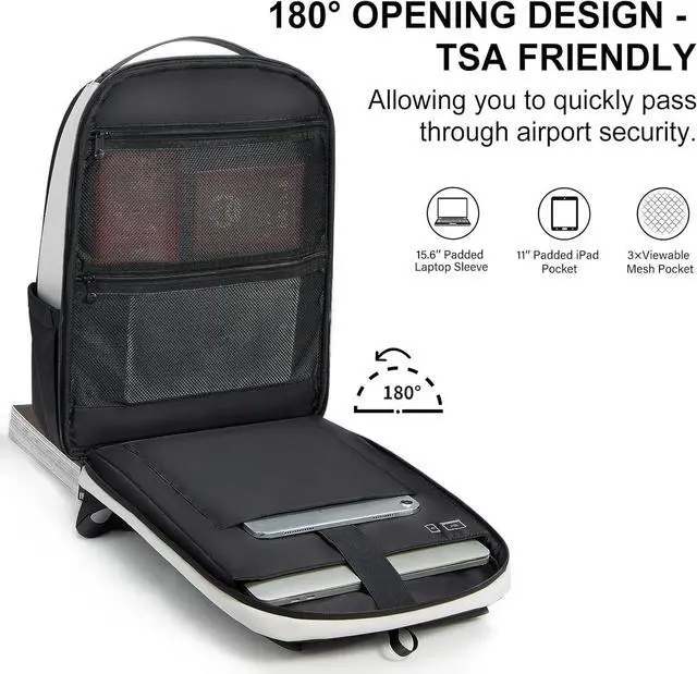 TRAVEL LOCKS FRIENDLY180 padded computer compartment fits up to 15.6 '' laptop, and the travel backpack can be freely unfolded 90-180 degrees, allowing you to quickly pass through airport security and keep things tidy. ^^ MULTIFUCTIONAL BACKPACKRoomy business backpack ( 11.8"L 5.5"W 17.3"H ) with shockproof iPad, laptop compartment, holds up to most 15.6 inch Laptop/MacBook/NoteBook. One spacious front packing compartment roomy for your phone, books, clothes, folders, power bank, pen, wallet and other items. Top zip pocket and flap over pocket for quickly accessing the small essentials.