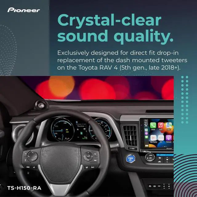 Upgrade your 2018-up Toyota RAV4s audio system with the Pioneer TS-H150-RA 1-1/8 Hard Dome Tweeters, exclusively designed to match the acoustic characteristics of the RAV4's cabin for an optimal sound field and smooth high-frequency reproduction. Offering improved sound over your factory speakers, these upper range tweeters are designed to deliver enhanced sound quality and performance, allowing you to enjoy your favorite music like never before. The tweeter is an essential part of your cars speaker system. Producing high-frequency sounds with clarity and precision, these tweeters seamlessly integrate with your vehicles entertainment system for a full, vibrant sound.