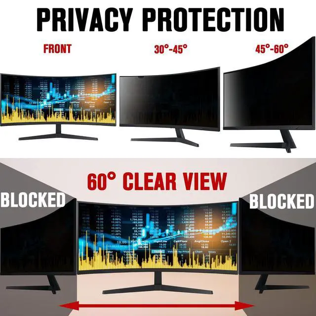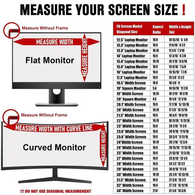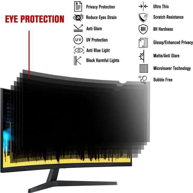 W*H: 31 1/4 * 13 3/8 (794mm x 340mm). Please measure monitor screen dimensions before purchasing. ^^ PRIVACY PROTECTIONProtect your data from visual hackers, cameras and work securely anywhere. Computer privacy filters work by blocking lights from certain angles to render your screen black. Your privacy filters' more than 60 degree viewing angle will not be able to read your information from screen, regardless of distance. ^^ ANTI GLARE/BLUE LIGHT/UV LIGHT/RADIATIONThe matte side of curved monitor privacy screen with anti-glare 80%, anti uv light 96%, anti-blue light 65%, scratch resistant and excellent color transmittance. Reducing eye strain, preventing myopia & dryness, hyperemia and so on, focusing on & effectively improving your work and kid's learning. ^^ EASY TO INSTALLIf the GROOVE between the screen and the frame is DEEPEN, recommend unremovable installation which is clearer than removable. PLEASE CHECK WITH SPECIFICATION BEFORE INSTALLATION OR CONTACT US. ^^ APPLICATIONComputer screen privacy shield is suitable for business traveler, students, mobile workers and commuters, as a safeguard sensitive corporate information while working in airplanes, subways, airports, school, cafe store, lab, library, finance and other public areas.