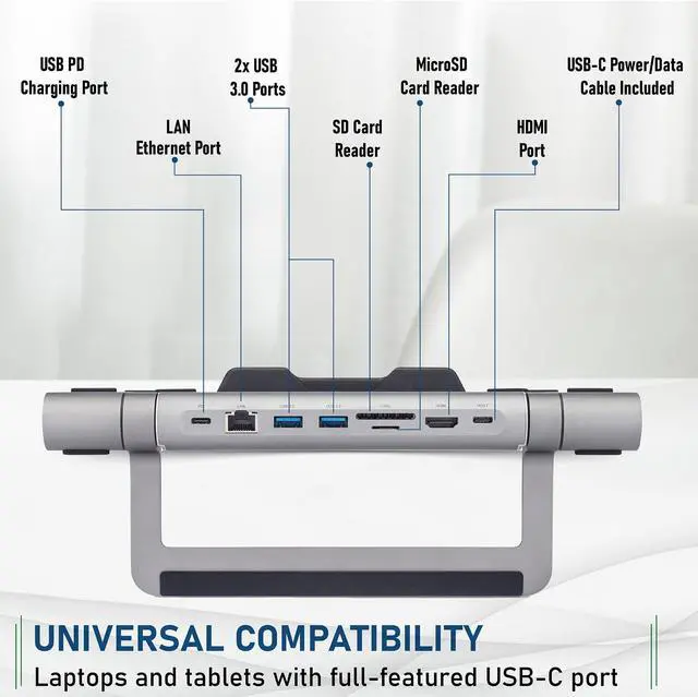 ClearClick 6-in-1 USB-C Portable Docking Station & Laptop Stand - 2X USB 3.0 Ports, HDMI, LAN Ethernet, SD Card Reader, MicroSD Card Reader, USB PD Charging