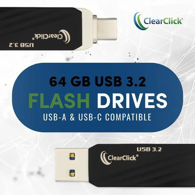 Includes Six (6) ClearClick 64GB USB 3.2 Flash Drives with Built-In USB-A and USB-C Connectivity ^^ Modern High Speed USB 3.2 with Extremely Fast Read & Write Speeds (Backward Compatible with USB 2.0 & 3.0 ) ^^ Plug and Play Compatibility with Desktops, Laptops, ClearClick Devices, Smartphones*, and Tablets* (*Must Support USB OTG) ^^ Each Drive Holds Up To 30 Hours of Standard Definition Video, 5 Hours of High Definition Video, 12, 000 Photos, or 8, 000