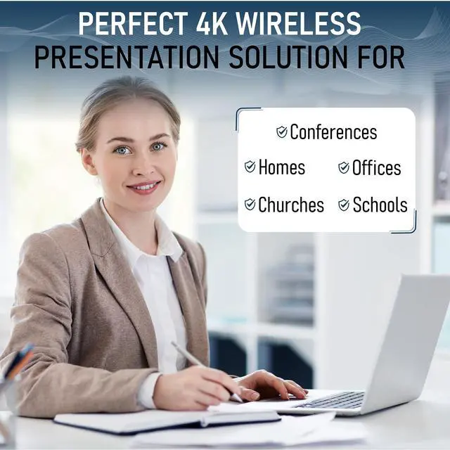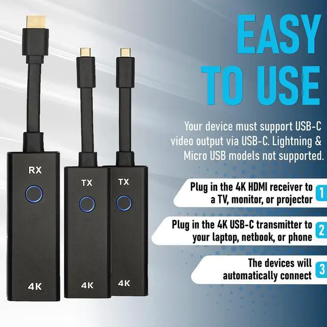 Securely Transmits Presentations & Video (Up To 4K / 30 FPS, Up To 160 Ft Range) Wirelessly From Laptops, Netbooks, & Smartphones To Any TV, Monitor, or Projector ^^ Kit Includes (2) 4K USB-C Transmitters & (1) 4K HDMI Receiver. Plug & Play - Just Connect The System & Press Transmit Button. Backward Compatible with HD 1080P. ^^ Perfect For Presentations, Universities, Company Boardrooms, Meeting Rooms, Libary Conference Rooms, and More (Uses Fast & Secure Encrypted 5 GHz WiFi) ^^
