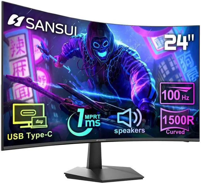 24 inch USB-C curved monitor with speakers built in for gaming, work or business.