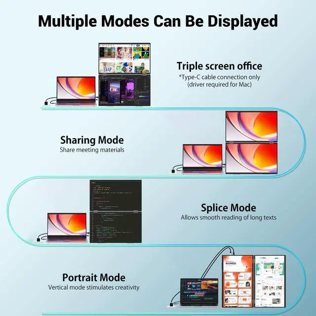 [(Multiple Display Modes)] The dual laptop monitor has extension mode, splicing mode and copy mode, and the Type-C full-featured cable connection device can achieve three different display contents, bringin
