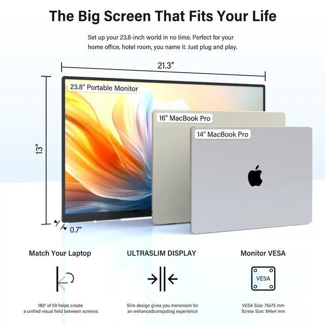 InnoView 23.8" 1080P Portable MonitorThe 23.8" portable monitor offers expansive viewing.This 23.8-inch portable monitor is lightweight and slim, allowing you to move it around the room at will.Making it the perfect second screen for enhancing your workflow, entertainment on the go.Perfect for professionals and gamers alike.