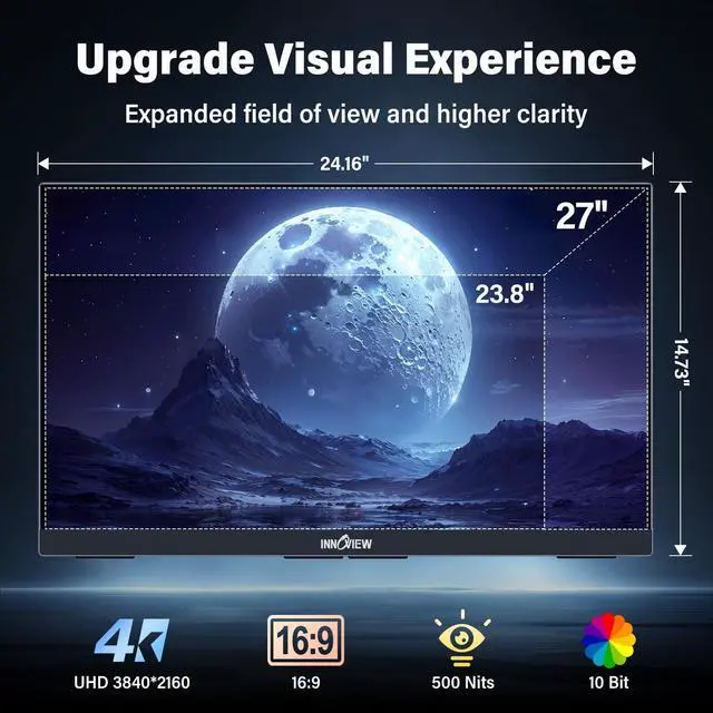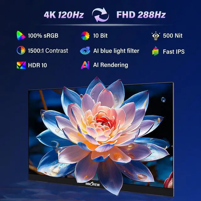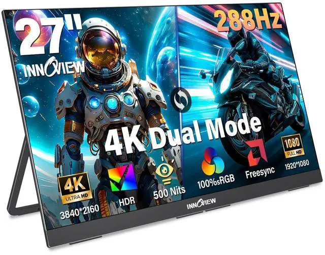 Dual-Mode Display: The INNOVIEW 27-inch portable monitor supports seamless switching between UHD and FHD modes. In UHD mode, enjoy 4K 120Hz clarity with vibrant colors and smooth motion, perfect for editing, movies, and office work. Switch to FHD mode for reduced tearing and lower lag, delivering a responsive gaming experience. This versatile monitor excels in gaming, entertainment, and creative work.