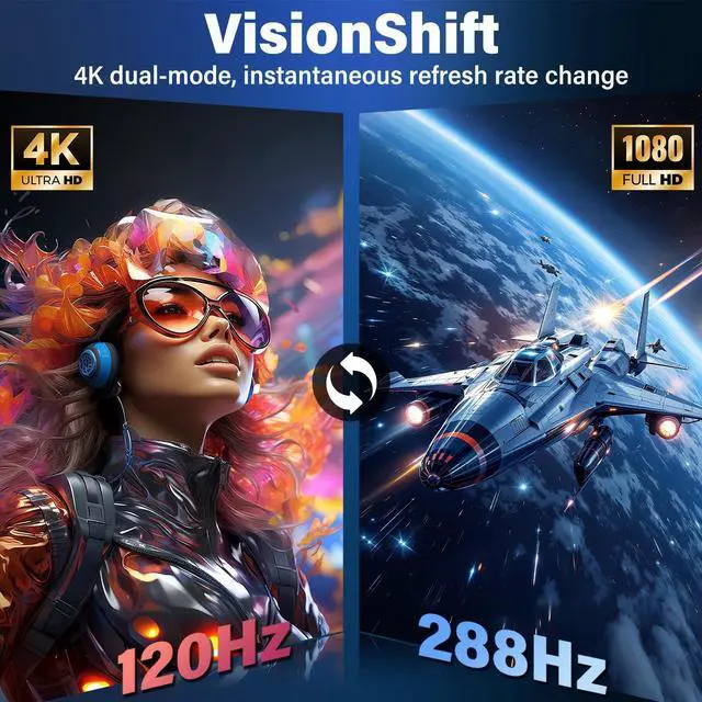 ^^ Dual-Mode Gaming: Switch between 4K UHD at 120Hz and FHD at 288Hz for an exceptional gaming experiencewhether you're immersed in visually stunning Triple-A titles or high-speed competitive games. With FreeSync technology and HDR support, it helps minimize stuttering and screen tearing for clearer, smoother gameplay.