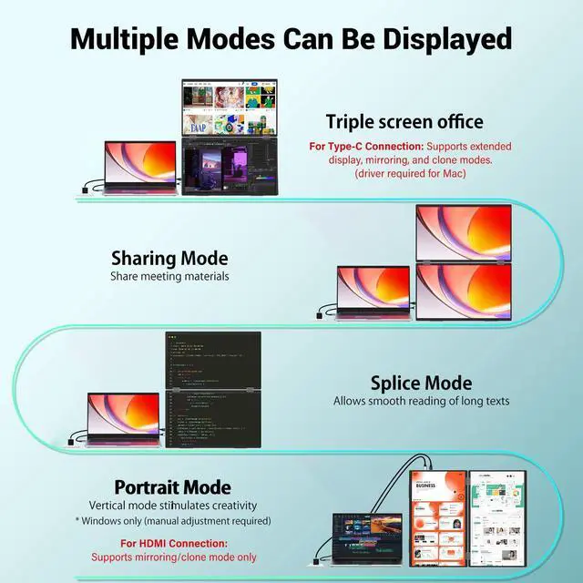The InnoView dual portable monitor for laptop instantly expands your workspace with zero driver setup required for Windowssimply connect via two Type-C cables (one for signal, one for power) using the included adapter. travel monitor offers three versatile modesextended, split-screen, and duplicatethough Mac users need a quick driver install for extended mode, and HDMI supports only duplicate/split-screen. Featuring two 15.6 -inch 1080P IPS displays, dual screen monitor ideal for multitasking, creative work, and on-the-go productivity, with a foldable design and 0-315 rotation that automatically adapts in Windows/Mac. For optimal performance, use a 30W+ power source, and enjoy peace of mind with 30-day returns and 18-month warranty support.