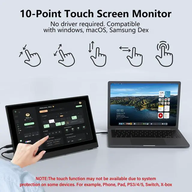 Portable Monitor]: Portable screen compatible with Windows and MacOS systems. You can get touch function for your laptop by connecting via single full-featured Type-C interface.: For Type-C 3.1 DP ALT-MODE or Thunderbolt 3/4 ports, please use the included USB-C to USB-C cable for power, video and touch. For devices without these ports, please use HDMI+power cable+USB-A to USB-C cable(If not connected, there is no touch functionality) ^^ [Get a