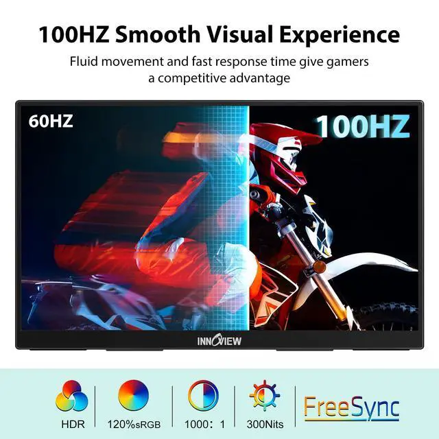 Refresh Rate Monitor: 100HZ ultra-high refresh rate and FREESYNC provide smooth, lag-free images, allowing gamers to react quickly to competition and enjoy a responsive gaming experience. 120% sRGB and 8-bit color depth, 16.7M colors make the image vivid and rich. With HDR technology, the content on the large portable screen comes alive, perfect for movies, games, work ^^ Huge Compatibility, Easy to